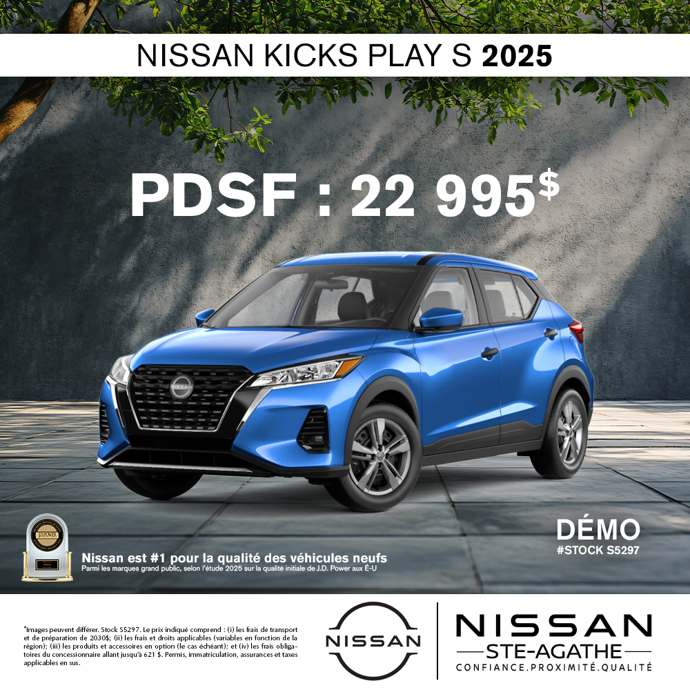 Ce Nissan Kicks Play 2025 est disponible chez Nissan Ste-Agathe à Sainte-Agathe-des-Monts. Contactez notre équipe des ventes ou venez nous visiter au 301 Rue Léonard pour obtenir plus d'informations, en faire l'essai ou le réserver.