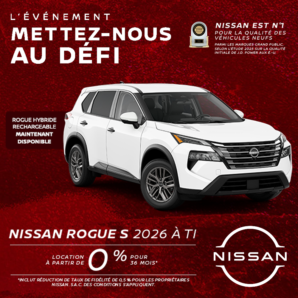Ce Nissan Rogue 2026 est disponible chez Nissan Ste-Agathe à Sainte-Agathe-des-Monts. Contactez notre équipe des ventes ou venez nous visiter au 301 Rue Léonard pour obtenir plus d'informations, en faire l'essai ou le réserver.
